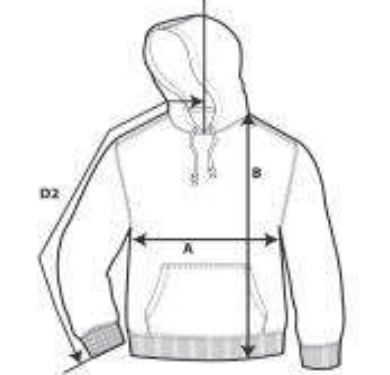 Afstand A op de onderstaande foto correspondeert met de omtrek in de matentabel, dit is dus eigenlijk eerder een breedte. Deze afstand moet gemeten worden onder aan de mouwen. Afstand B is de lengte en moet gemeten worden vanaf de hoek van de kap tot helemaal onderaan de pull.
